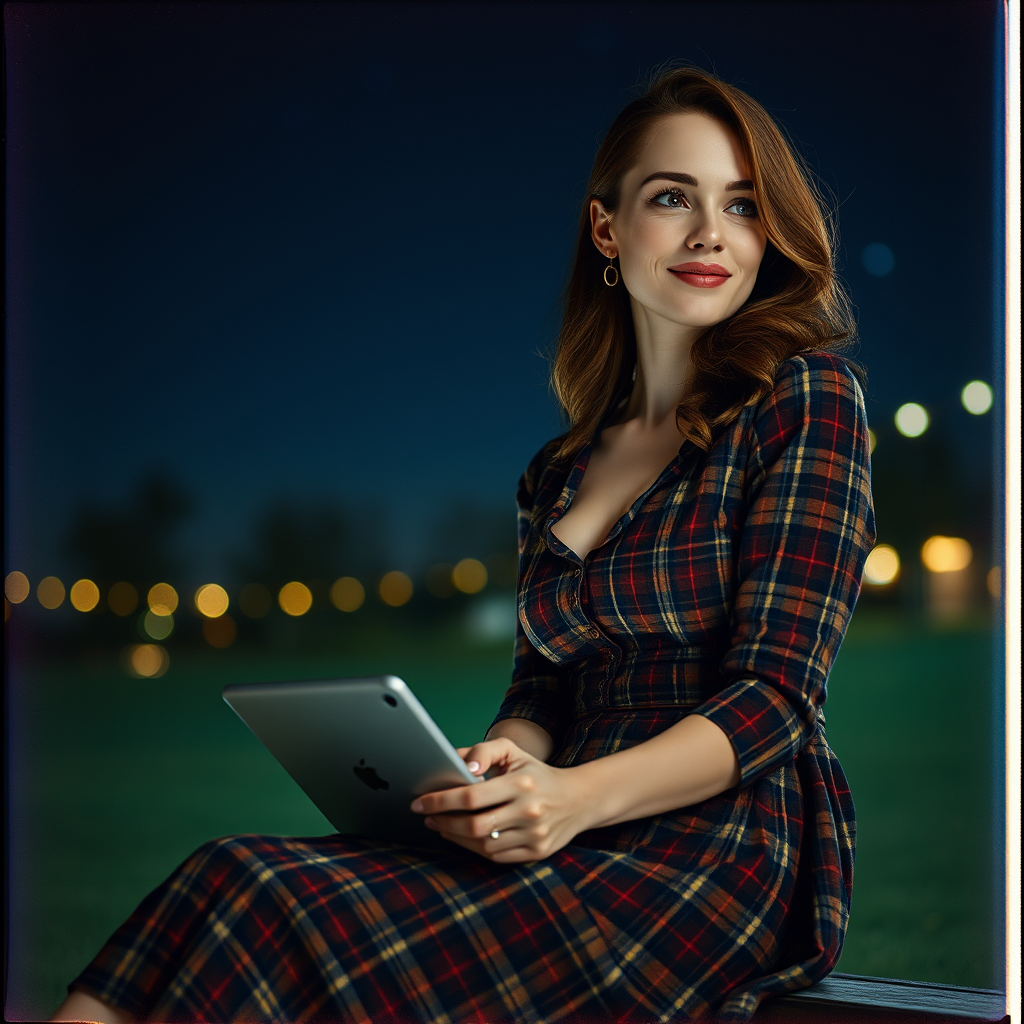A beautiful woman sits gracefully holding a tablet, dressed in a sophisticated tartan dress, set outdoors under a starry night sky. The scene is illuminated with soft, atmospheric lighting, capturing a sense of realism and exquisite detail, evoking a vintage film feel. Photographed with low contrast and in ultra-high resolution, the imagery highlights the lush textures and subtle hues, maintaining an air of elegance and serene ambiance.