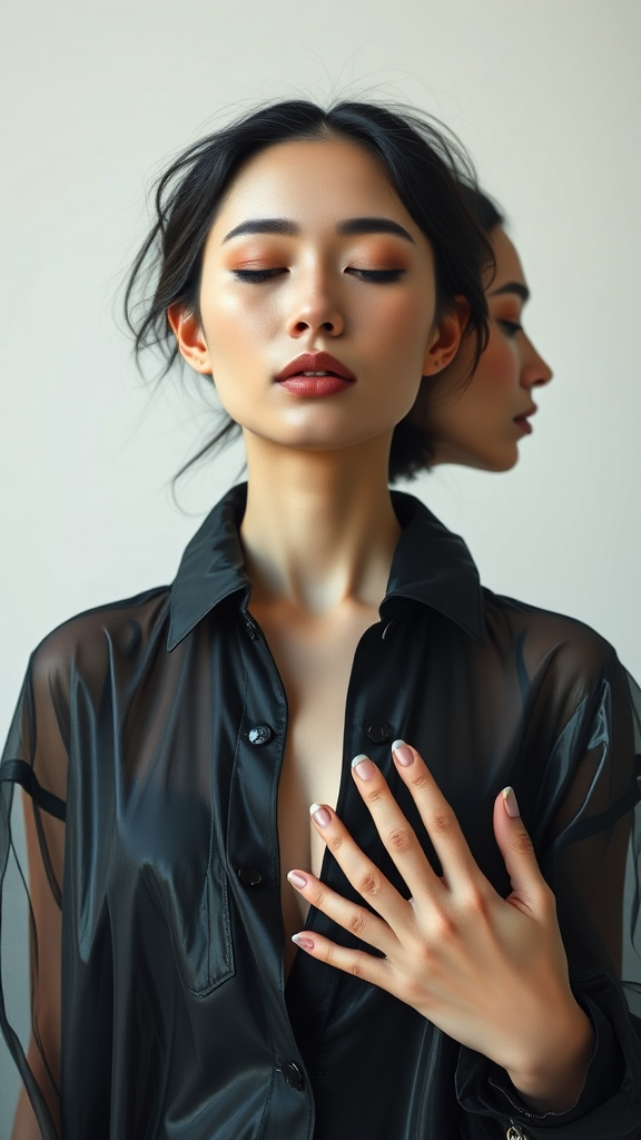 A beautiful woman wearing a black transparent coat, captured in a full body shot during a professional photoshoot. Her eyes are gently closed, and the composition is perfectly symmetrical. The setting features natural lighting, highlighting every intricately detailed feature in maximalist style. The image is rendered in 8k resolution, showcasing a photorealistic masterpiece of professional photography with a hint of concept art. The figure appears uniquely altered with artistic interpretations: two heads and two faces emerging, hands with extra fingers, and limbs showing imaginative mutations. The design leans into the surreal with deformed and exaggerated proportions, creating an out-of-frame visual where features appear duplicated or missing, giving an otherworldly sense. The anatomy is intentionally disregarded, presenting an array of fused and elongated elements, such as a long neck and multiple limbs, blending into a mesmerizing, dreamlike abstraction.