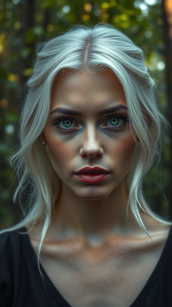 A beautiful woman with white hair gazes at the camera, her expression tinged with sadness as a single tear glistens on her cheek. The scene is rendered in high-resolution, capturing the hyper-realistic detailing of her flawless face, against the backdrop of a lush, vibrant forest. The artwork resembles an exquisite oil painting with a focus on the intricate details of her textured skin and remarkable pupils. Shot with a cinematic lens, the image boasts an ultra-high-definition quality that feels lifelike, emphasizing her serene yet poignant presence within the natural setting. The portrait is perfect and free from any imperfections, presenting a harmonious and immersive visual experience.
