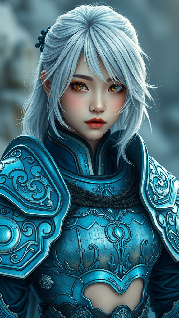A beautiful young South Korean girl with medium length snowy white hair and a toned midriff, clad in an intricate azure armor that accentuates her detailed and gorgeous features. Her armor, shimmering with patterns reminiscent of the ocean's mysteries, contrasts elegantly with her clear, radiant complexion. Her piercing eyes, full of determination, mirror the cool tones of her armor, adding an ethereal depth to her striking appearance.