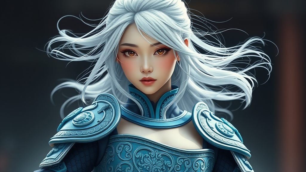 A beautiful young South Korean girl with medium length white hair and a toned midriff is adorned in intricately designed azure armor that highlights her graceful silhouette. Her detailed, gorgeous face reflects both strength and elegance, framed by strands of her strikingly white hair that dance with every movement. The azure armor, with elaborate patterns and a sheen reminiscent of a calm ocean, complements her ethereal beauty and the serenity in her gaze.