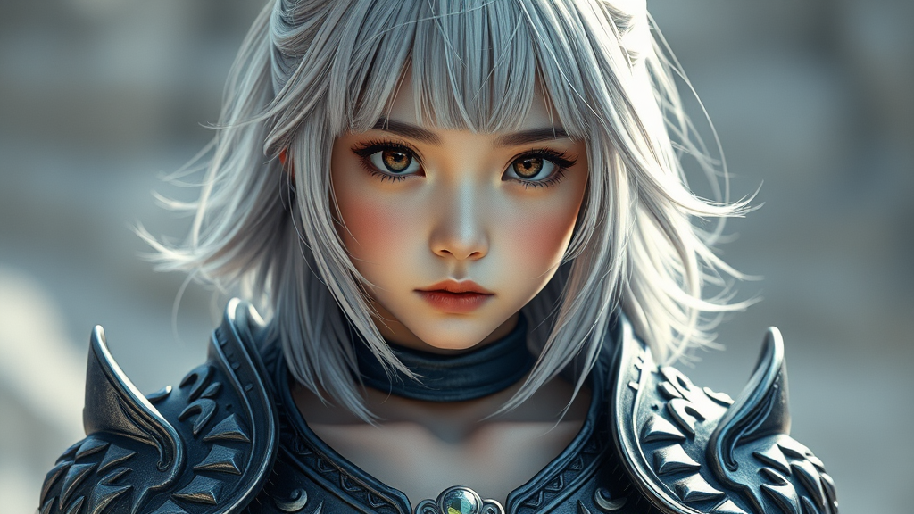 A beautiful young South Korean girl with medium-length silver hair and a toned midriff, clad in intricate sapphire-hued armor, showcasing a detailed and striking face.
