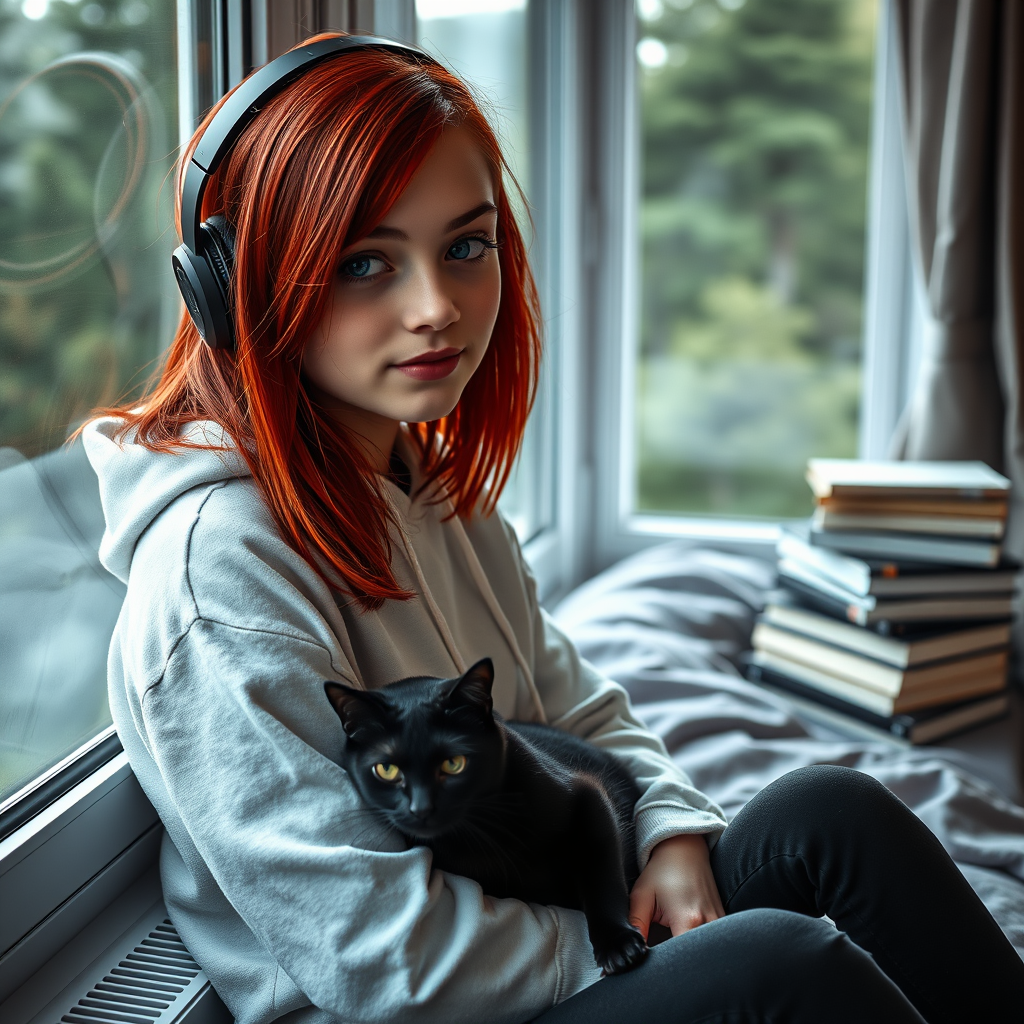A beautiful young Swiss girl is seated by the window, wearing headphones, surrounded by books. She is dressed in a white hoodie and black jeans. Her striking features include neon-colored eyes, vibrant red hair that falls to medium length, a smooth nose, and thin lips. The girl gazes thoughtfully out the window, then turns her warm gaze towards the camera. A sleek black cat relaxes on her lap. In the background, a bed is partially visible, stacked with more books. The window is open, revealing a lush forest outside, setting a serene scene in muted tones. The photograph, taken with an 85 mm lens, captures the essence of natural, soft lighting typical of a professional, high-resolution portrait. The lighting emphasizes a magical, photorealistic atmosphere, focusing on intimate details and dramatic contrasts, creating an engaging and lifelike composition.