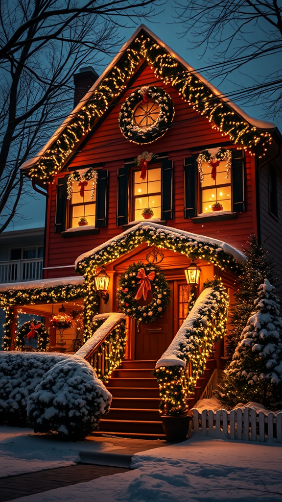 A beautifully adorned house for Christmas, with twinkling lights and elegant ornaments, set against a snowy backdrop, captured in cinematic HD quality with a warm and inviting glow, evoking a sense of festive wonder and holiday spirit.
