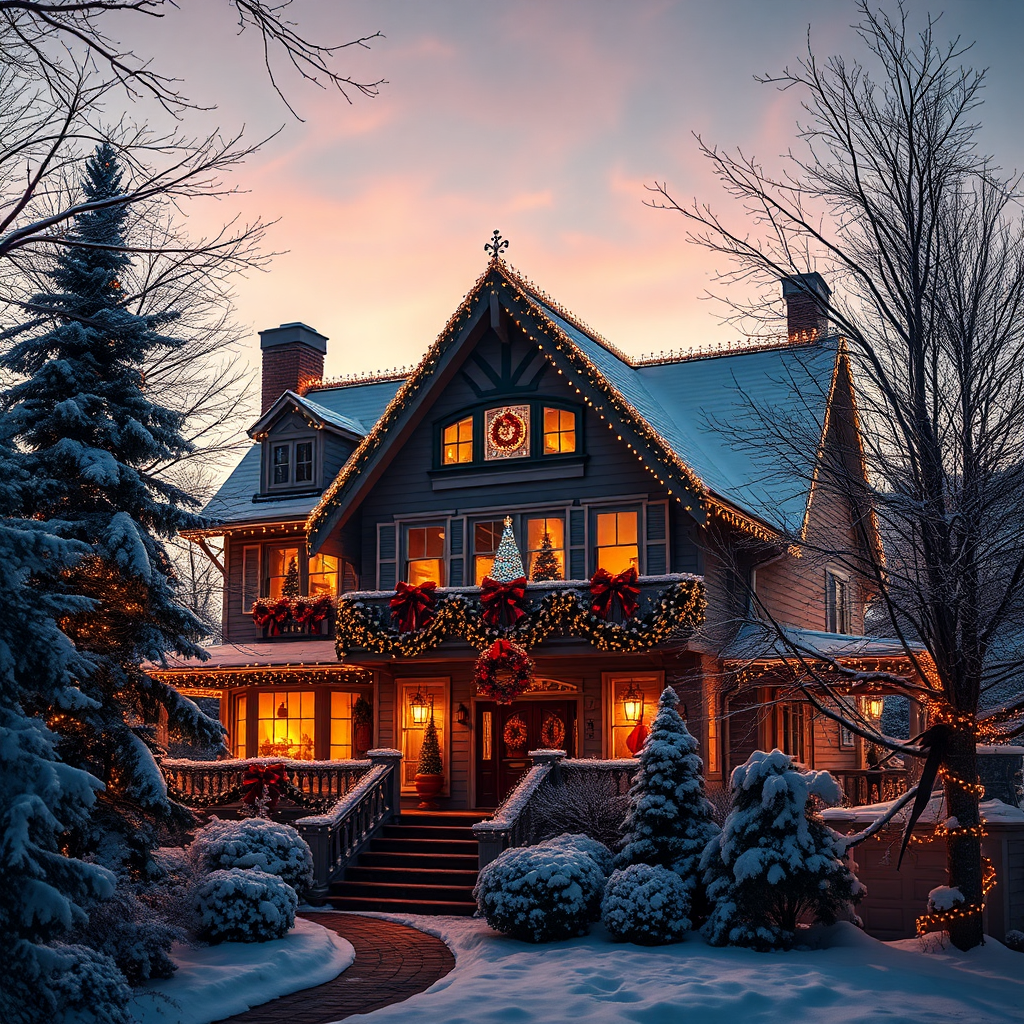 A beautifully adorned house in a winter wonderland, twinkling with festive Christmas lights and elegant decorations, surrounded by snow-draped trees, set against a soft glowing twilight sky, captured in stunning HD cinematic quality.