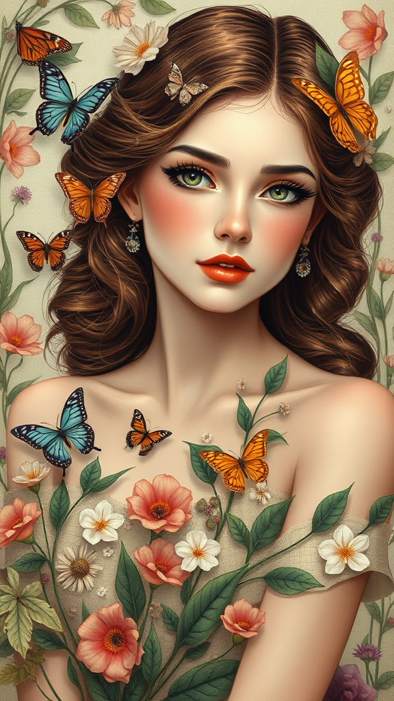 A beautifully aesthetic portrayal of a Russian girl with intricate and super detailed features, emphasizing an artistic and fantastic vintage style. Her vivid and colorful appearance is complemented by a minimalistic touch. She has long, elegant eyelashes and a slender body, adorned in a dress crafted from leaves. Flowers and butterflies are gracefully intertwined with plants, creating a dynamic composition. She is seated gracefully, embodying a sense of vivid life and artistry. The image captures an ultra-high-definition spectacle in 8K, ensuring every detail is crystal clear and vibrant. The focus rests on showcasing beauty, elegance, and harmony with nature.