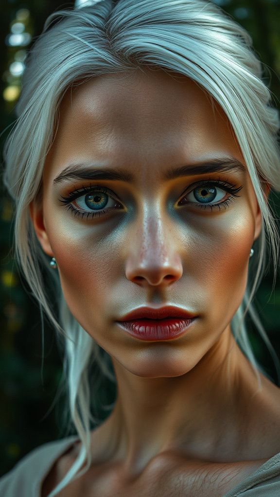 A beautifully captivating woman with striking white hair gazes intently at the camera, conveying a sense of sadness with a single tear gracing her cheek. Her face, depicted with hyper-realistic detail and flawless features, stands out in sharp focus against a lush, forested backdrop. Oil painting techniques bring out the rich textures of her skin and the remarkable intricacies of her eyes. The image is crafted as though captured with a high-resolution, cinematic camera, emphasizing every nuance and detail, from the lifelike texture of her skin to the vibrant colors of the forest setting. The artwork avoids any distortions or imperfections, presenting a scene of poignant beauty and emotional depth.