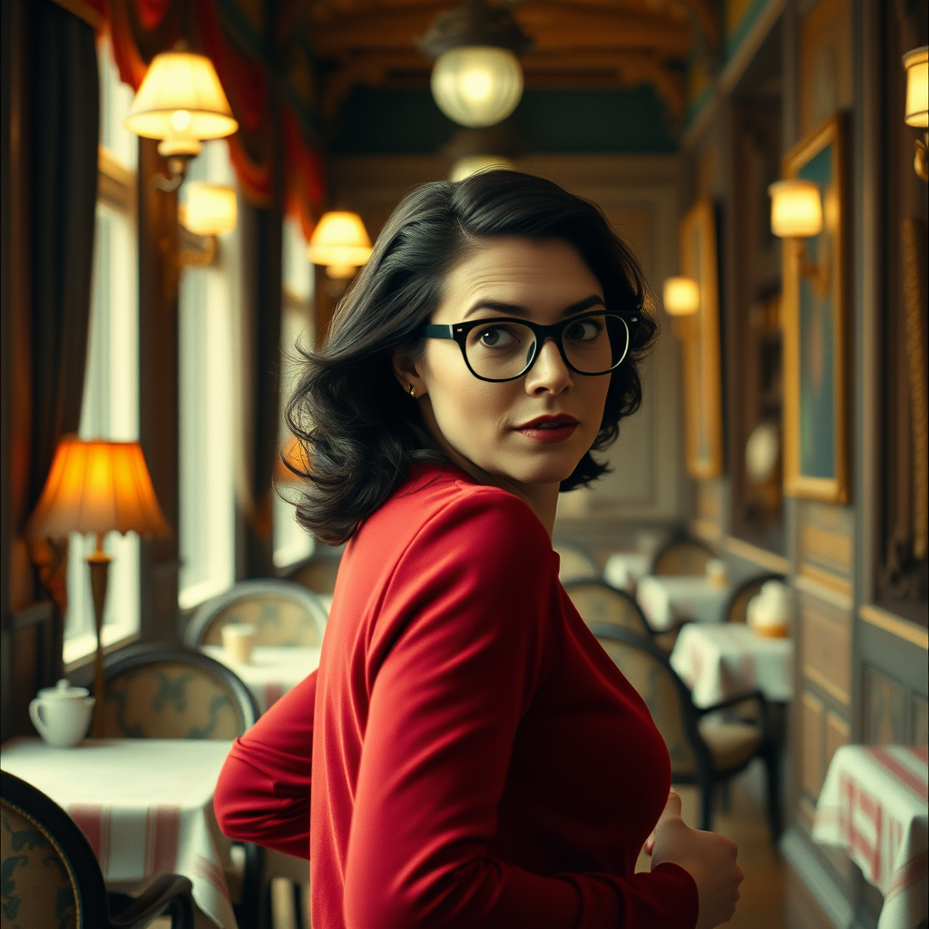 A beautifully cinematic scene captures a woman with glasses, her expression a blend of urgency and intrigue, glancing back towards the camera as she runs. The setting radiates a cozy warmth, each intricate detail meticulously crafted in the signature style reminiscent of The Grand Budapest Hotel. The scene is shot in glorious analog, evoking the charm of 35mm film, infusing the frame with a nostalgic, timeless quality. The composition, with its symmetrical balance and vibrant color palette, tells a story within a frame, inviting the viewer into a whimsical world where each element is deliberate, creating an atmosphere both familiar and fantastical.