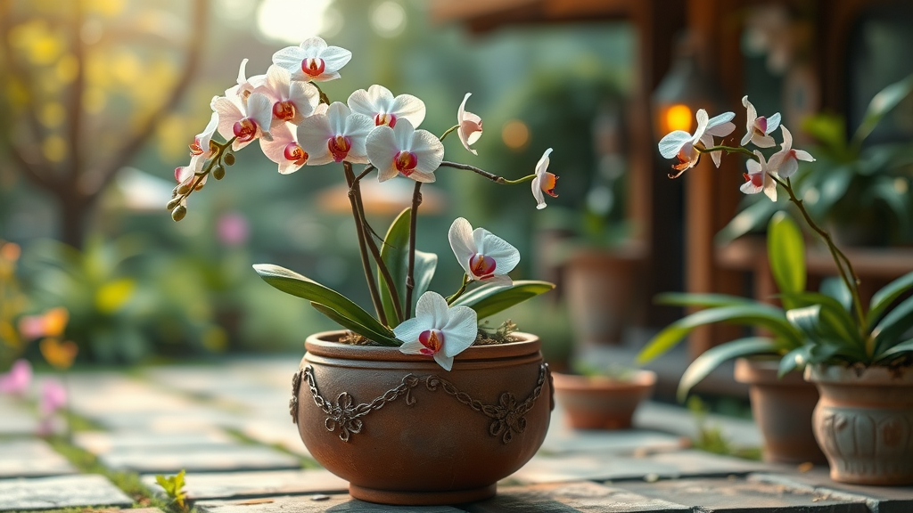 A beautifully crafted flower pot filled with delicate orchids sits in an enchanting outdoor scene, capturing attention with intricate details and an impeccable sense of the rule of thirds. The image evokes a cinematic quality with its vibrant colors and dreamlike atmosphere, reminiscent of a Studio Ghibli masterpiece. The scene, while grounded in reality, subtly leans into the fantastical, offering an air of whimsy and wonder, as if painted by an imaginative artist with a flair for storytelling.