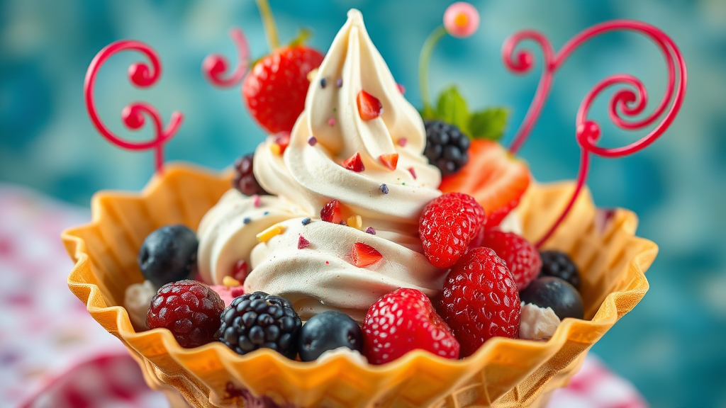 A beautifully crafted ice cream sundae nestled in a waffle cone bowl, adorned with an assortment of fresh berries and tantalizing toppings, showcasing vibrant ultra-high-definition details with rich colors and astounding clarity. The whimsical presentation features an extravagant, fantastical twist: imaginative, quirky elements like playful swirls, elongated shapes, and whimsical distortions, creating an enchanting and surreal visual delight. The scene maintains a dream-like quality, with intricate textures and a captivating composition that teases the senses, celebrating indulgence and fantasy in a harmonious and visually stunning tableau.