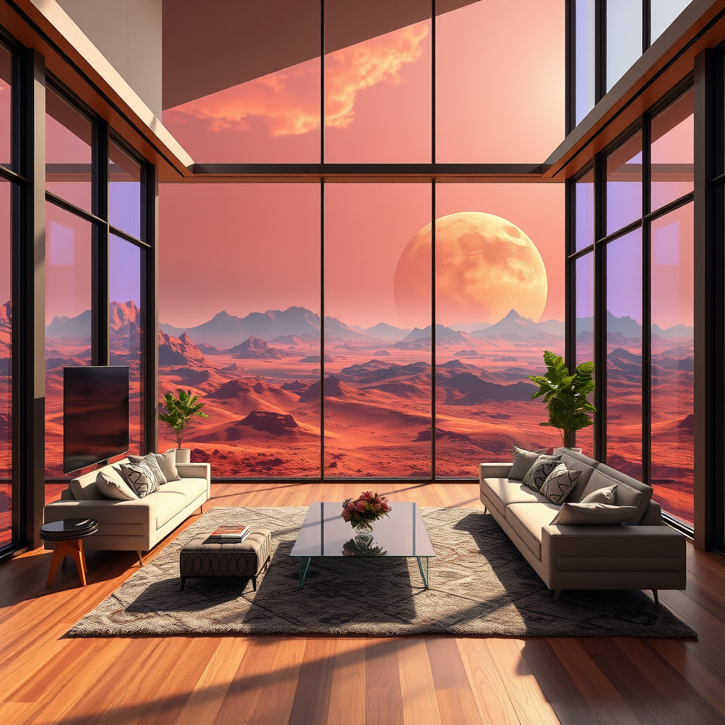 A beautifully designed modern living room with large windows showcasing a breathtaking view of the Martian landscape outside, merging the realms of fantasy and reality. The digital artwork is high-resolution, with intricate details that make it a stunning portfolio piece. This matte work, inspired by the styles of Bryan Organ and Greg Rutkowski, features vibrant and rich colors that would be trending on art platforms. The scene balances realism with imaginative elements, ensuring a captivating and immersive experience.