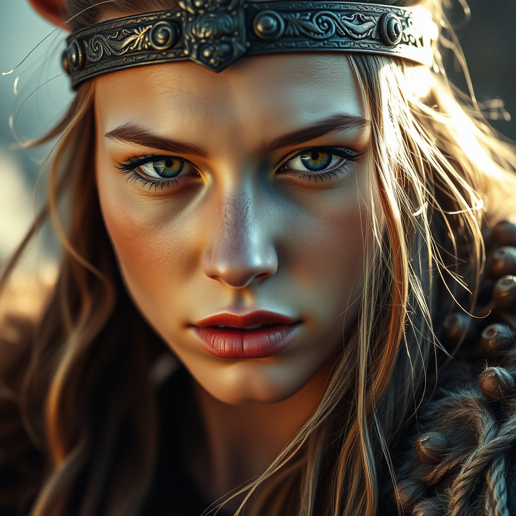 A beautifully detailed and realistic portrait of a modern female Viking captured with soft natural lighting, reminiscent of portrait photography shot with an 85mm lens. The image is infused with a sense of magic through dramatic lighting, achieving photorealism with ultra-detailed, intimate portrait composition. Features a Cinestill 800T low-resolution aesthetic, with elements of text and intentional errors for artistic effect. The composition includes aspects such as cropped framing, jpeg artifacts, and unconventional touches like signature elements, abstract anatomy, and creative distortions. The portrayal embraces imperfections, with hints of disfigured or blurred aspects that convey a sense of out-of-frame mystery, tiling patterns, and a deliberately flawed beauty. Subtle watermarks blend into the artwork, enriching the complex visual narrative.