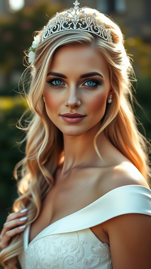 A beautifully detailed and realistic portrait of a bride with striking blue eyes and long, flowing, golden blonde hair adorned with an elegant tiara, captured outdoors. She wears a graceful off-the-shoulder ivory wedding dress. Her skin is luminous, enhanced by soft, natural light. The portrait is shot with an 85mm lens, creating a magical and cinematic atmosphere, accentuated by volumetric lighting. In this ultra-realistic, photorealistic composition, the intricate details of her expression and attire are emphasized, bringing the essence of her wedding day to life.