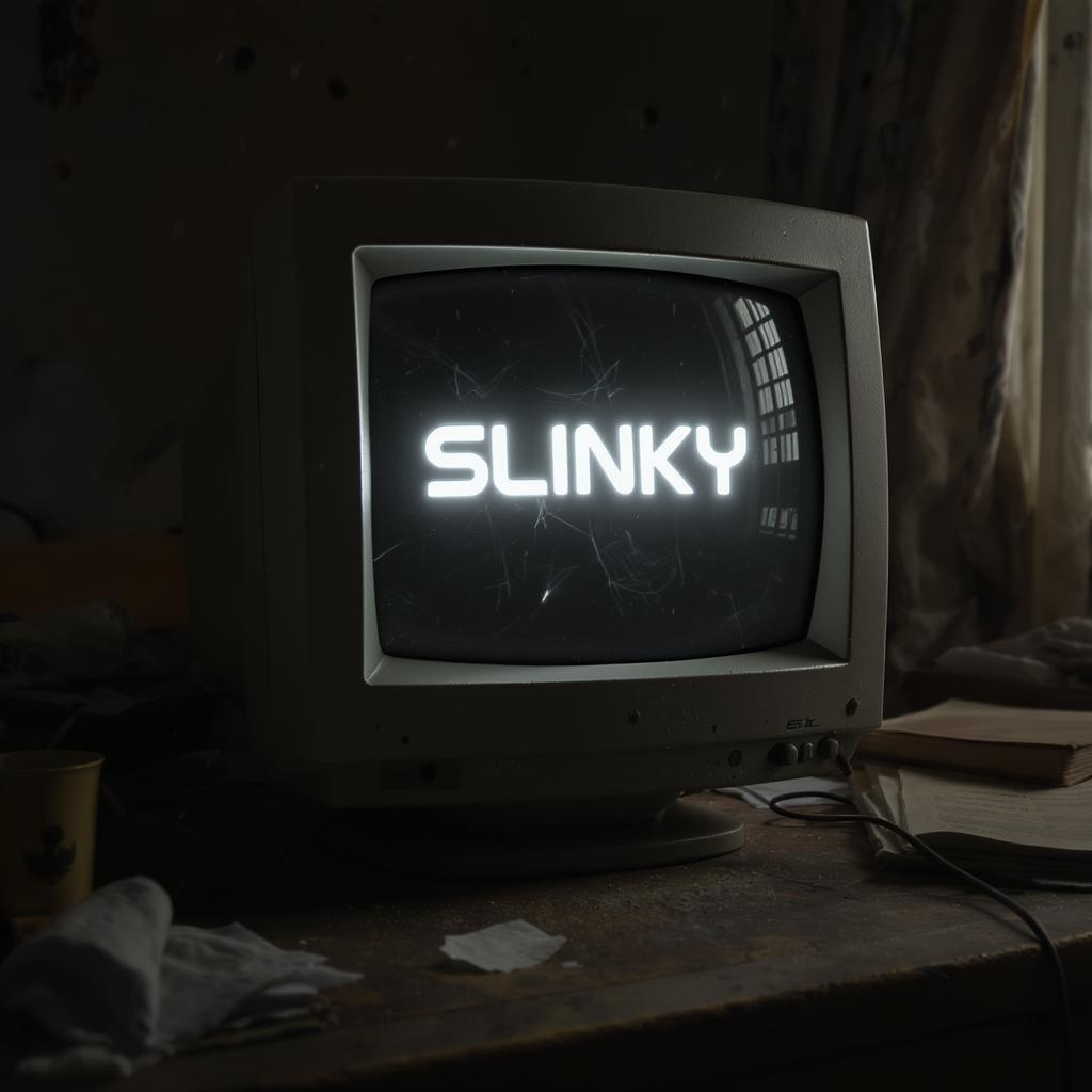 A beautifully detailed cinematic depth-of-field render captures an old, dusty CRT monitor sitting on a worn wooden desk in a dimly lit, cluttered room. The room is lined with various scattered items and hints of a messy, lived-in atmosphere. On the screen, the word "SLINKY" emits a soft, nostalgic glow, casting reflections onto the curved glass surface. The CRT's surface is richly textured, showcasing years of wear and dust accumulation. Subtle shafts of light filter through partially drawn curtains, illuminating motes of dust in the air. A few personal trinkets and forgotten objects occupy the desk space, adding layers of history and intrigue to this evocative scene, while the hum of the monitor adds an almost audible sense of presence.