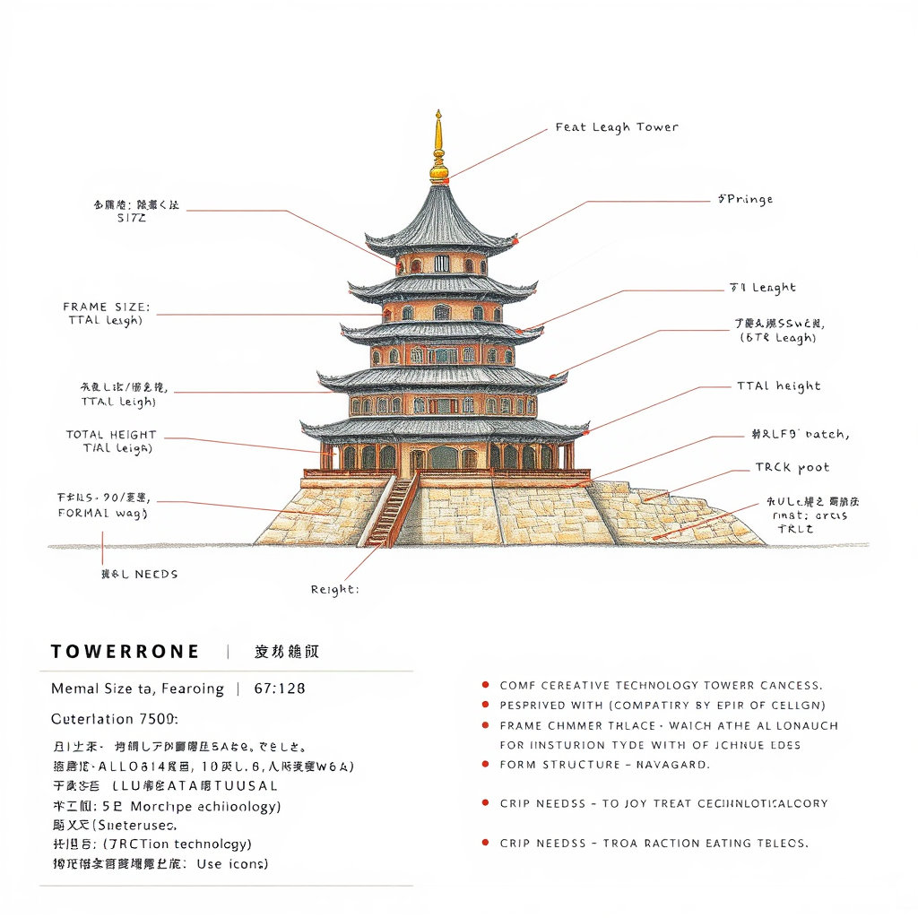 A beautifully detailed cross-section of an ancient Chinese tower, depicted in a color pencil style with realistic shadows, capturing its intricate construction techniques and design elements. Each tower level is carefully labeled to highlight key features such as rooms, bridges, or architectural details, providing insight into its unique structure. A text panel at the bottom offers comprehensive information about the tower's historical significance, including frame size, dimensions, total height, weight, materials used, and form structure type. It also elaborates on the construction technology, user needs, and displays various related drip icons. The tower is set against a white background with the artwork maintaining an aspect ratio of 67:128, enhanced by a stylization level of 750. Minor creative modifications are made to enhance the core concept while maintaining its authenticity and charm.