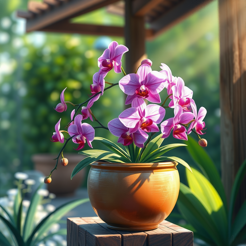 A beautifully detailed flower pot holding vibrant orchids sits gracefully in an outdoor scene, bathed in soft, natural light. The composition follows the rule of thirds, capturing a serene and cinematic atmosphere reminiscent of a Studio Ghibli masterpiece. The scene is rendered in vivid, high-resolution detail, with an enchanting touch of whimsy and fantasy. Delicate brushstrokes evoke the gentle movement of a soft breeze, and the orchids' petals are depicted in an array of striking colors. The background is lush with greenery, adding depth and richness to the tranquil setting, creating a harmonious and picturesque painting.