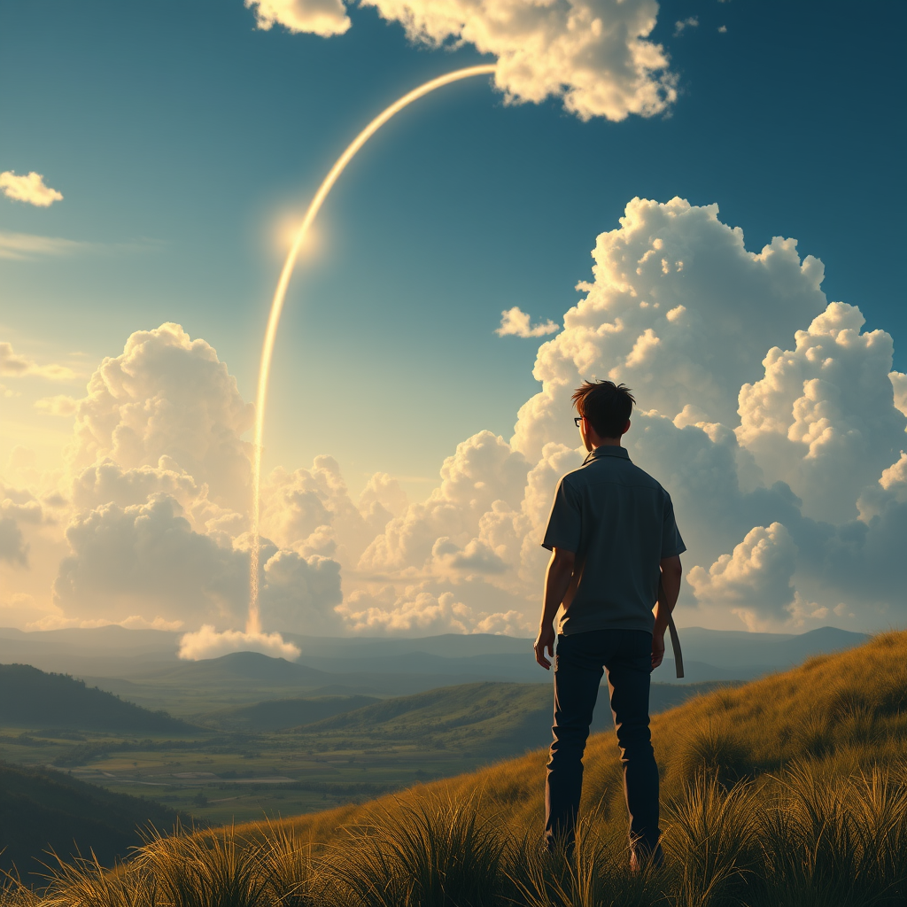 A beautifully detailed matte painting of a man standing on a hill, gazing at a rocket launch in the distance, inspired by Studio Ghibli's enchanting storytelling, Makoto Shinkai's cinematic brilliance, and the artistic styles of Artgerm, WLOP, and Greg Rutkowski. The scene features stunning volumetric lighting, rendered in Octane, and captures a serene moment in 4K resolution. The composition showcases the expansive sky with dramatic clouds and gentle sunlight illuminating the landscape, while the rocket's trail arcs majestically upward. The man is depicted with a contemplative expression, his silhouette subtly defined against the vibrant background, capturing a sense of adventure and wonder. The painting excels in masterful detail and impression without any technical flaws such as text errors, low resolution, or imperfections, ensuring a captivating and seamless visual masterpiece.