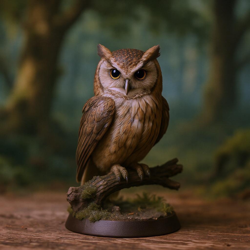 A beautifully detailed miniature of an owl perched on a branch, intricately designed for a Dungeons & Dragons game, capturing the sharp focus of its features and feathers with an enchanting medieval forest background in a 3:4 aspect ratio.