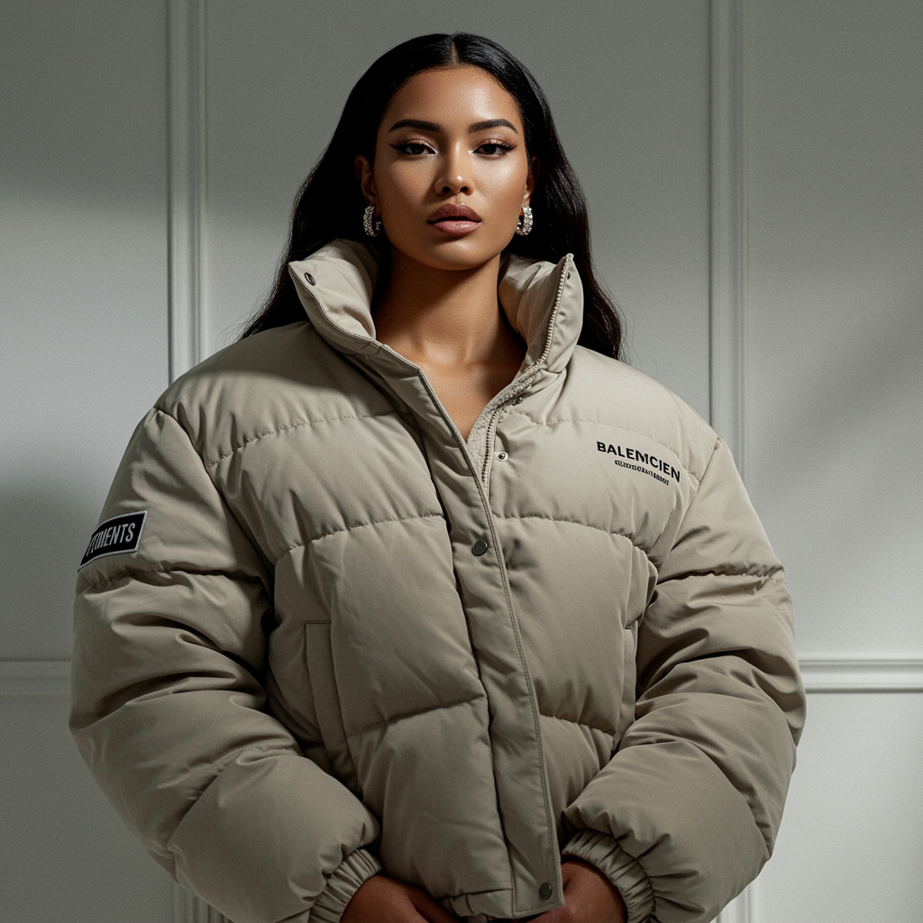A beautifully illuminated fashion portrait featuring an extraordinarily stunning woman adorned in an oversized puffer jacket designed by icons such as Craig Green, Dingyun Zhang, Yeezy, Balenciaga, and Vetements. The image captures sharp focus and clarity with intricate details, presenting a cinematic and sophisticated essence. The setting exudes an off-white, glamorous aesthetic, with symmetrical composition reminiscent of a Vogue editorial photoshoot. The glossy finish enhances the magazine-worthy fashion narrative, marrying high fashion elegance with avant-garde flair.