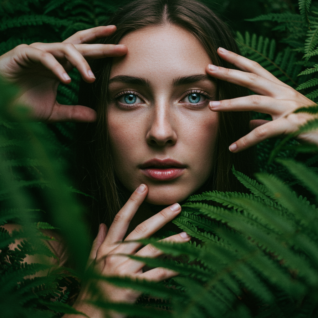 A beautifully intricate close-up of a woman poised above a lush rainforest, her eyes shimmering with an ethereal allure, set in ultra-high-definition. She exudes an otherworldly charm, though her hands appear slightly blurred with unusual anatomy, adding an abstract quality. The image exhibits low-resolution areas with occasional jpeg artifacts, subtle hints of a signature or watermark blend into the background. There is an intriguing play on realism as her fingers appear inconsistent, with occasional extra or missing digits, enhancing the surreal aspect. Despite these artistic imperfections, the portrait maintains a captivating presence, blending mystery with natural beauty, as if from a world just beyond our own.