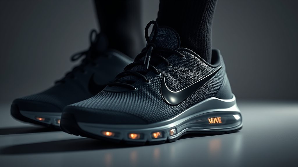 A beautifully lit image of Nike pace shoes crafted from high-tech rubber and composite fibers, featuring a sleek black Nike logo. The photography is inspired by the style of Steven Meisel, showcasing exquisite indirect lighting. Rendered with Unreal Engine and Octane for a hyper-realistic finish, this HD, IQ 180 image captures the essence of innovation and design, with a subtle artistic twist in color tones and texture details, set against a minimalist background to highlight the shoes' craftsmanship. Aspect ratio 2:3, quality emphasis retained.