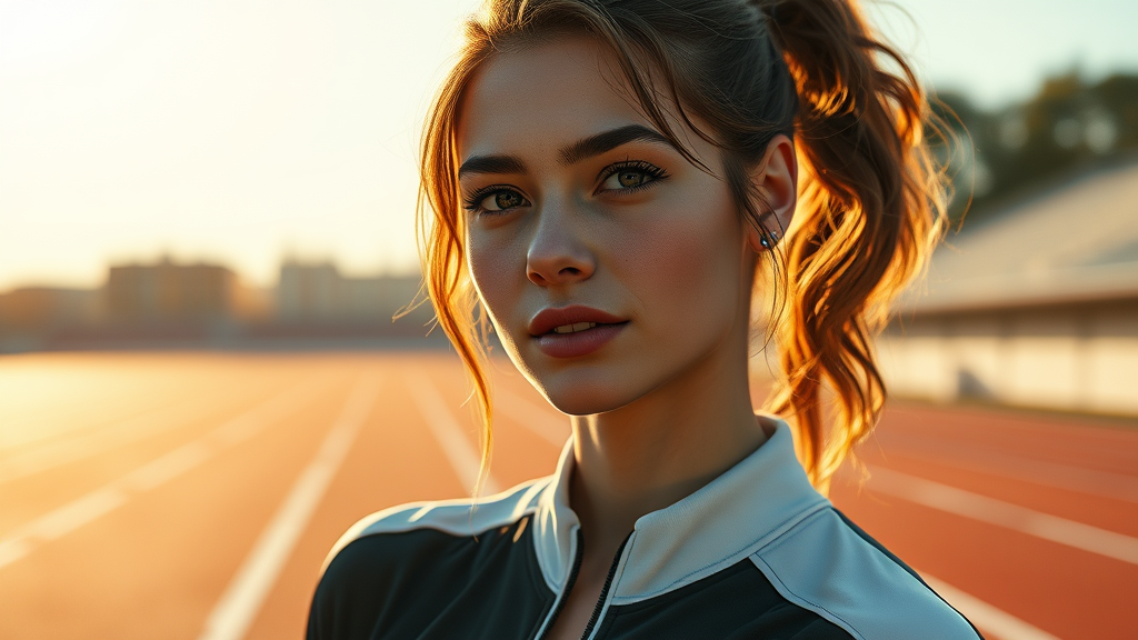 A beautifully mature college girl in a sleek track outfit stands on a sunlit track field, captured in a photorealistic and highly detailed digital artwork. The scene is a masterpiece, displaying remarkable realism with intricate skin texture and hyper-detailing, set in stunning 8k HD resolution. Inspired by the style of Lee Jeffries and shot with a Nikon D850 using Kodak Portra 400 film stock, the image boasts rich colors and lifelike textures. The dramatic lighting and hyper-realistic elements echo trends on Artstation and Unreal Engine, showcasing a sense of vitality and movement. The composition retains exceptional quality with vivid, sharp details, focusing on the subject's authentic and natural expression, surrounded by an aura of confidence and grace.