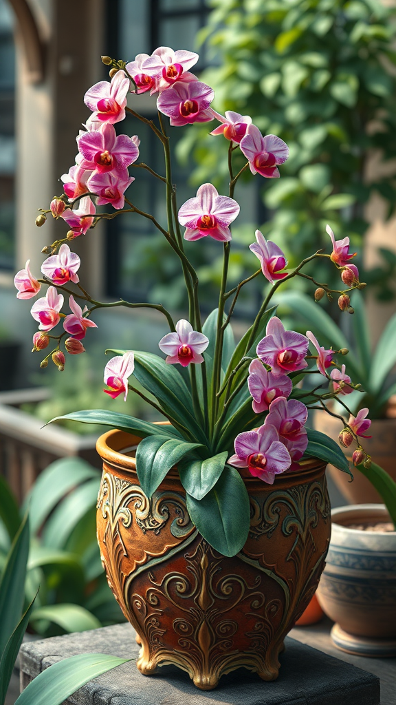 A beautifully ornate flower pot holds an array of vibrant orchids, nestled gracefully in an outdoor setting. The scene is highly detailed, framed perfectly using the rule of thirds to draw the eye to the centerpiece. Rendered with absurd resolution, this masterpiece captures the essence of a whimsical Studio Ghibli painting, infusing elements of fantasy and realism. While evoking the charm of a slightly eccentric artist, it maintains an enchanting and dreamlike quality, creating a captivating visual experience. The painting captures a serene moment, inviting the viewer into a peaceful world where nature and imagination intertwine.