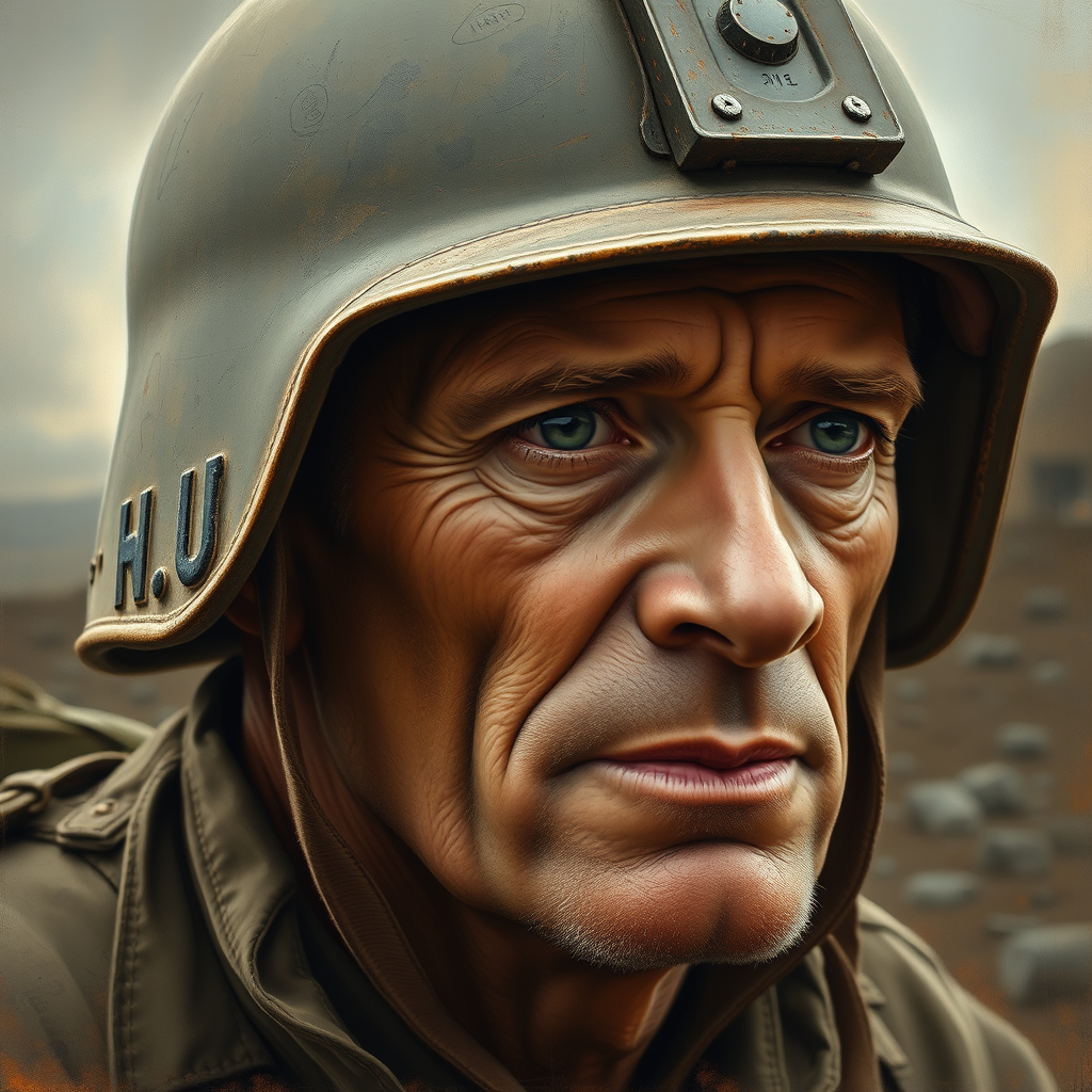 A beautifully painted, oblique view portrait of a seasoned World War II U.S. Marine soldier wearing a weathered helmet, capturing a sense of wisdom and resilience. His face, lined with stories of courage and sacrifice, is rendered in exquisite detail, inspired by the artistic styles of Greg Rutkowski and Magali Villeneuve. The background subtly hints at a war-torn landscape, contrasting the soldier's calm and determined expression, adding a layer of depth to the narrative. The color palette is rich and earthy, with warm and muted tones that highlight his piercing eyes and the texture of his uniform, creating an evocative and timeless depiction.