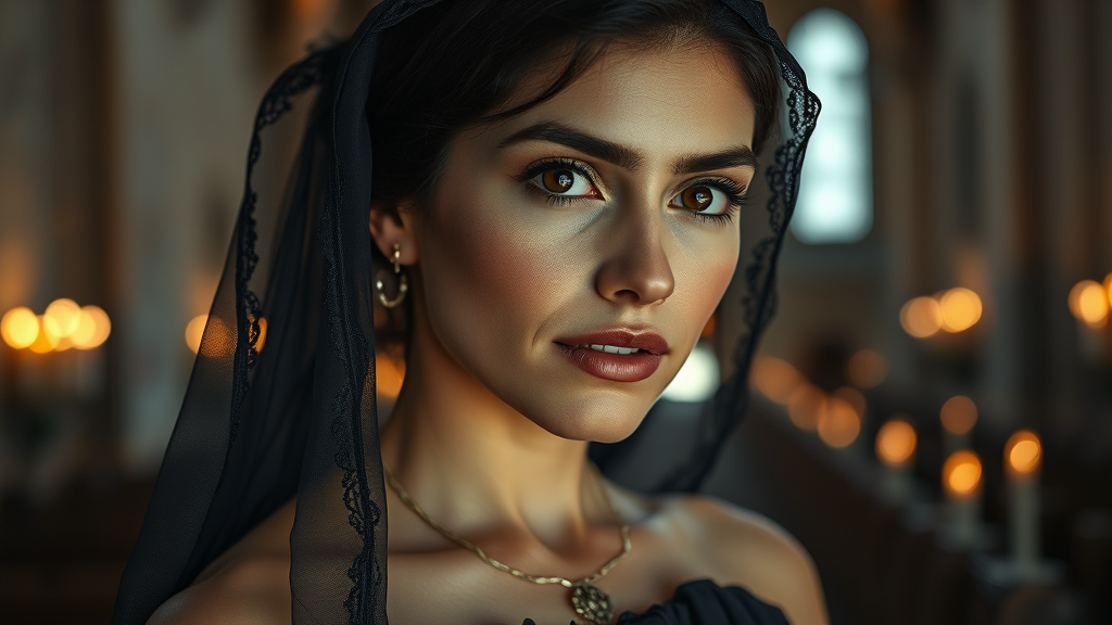 A beautifully poignant portrait captures the essence of a Spanish widow, her elegance enhanced by a delicate black lace veil. Evoking the visual mastery of Nadav Kander and Annie Leibovitz, the composition embraces the golden ratio, drawing the viewer into her world. The dramatic lighting casts a gentle glow over her angelic face, highlighting expressive eyebrows and lovely, large, bright eyes that speak of silent strength and resilience. A simple yet tasteful earring and necklace adorn her, adding a touch of understated elegance to her strapless attire. The ambience suggests serenity with flickering candles, echoed in the soft, blurred bokeh of a grand old church, evoking a sense of timeless beauty. Her confident expression speaks volumes, a testament to endurance and grace in the face of sorrow, reminding us that the world, in all its complexities, is profoundly beautiful. Her presence, striking in its simplicity yet profoundly detailed, commands attention and admiration, akin to a scene from CinémaScope.