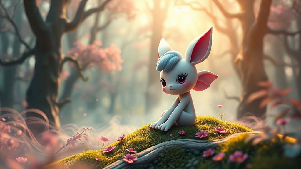 A beautifully rendered solo art piece featuring a Kawaii character seated in an enchanting mystical forest, with the full character concept exploring trending color palettes. The scene is reminiscent of a matte painting with a stunning depth of field, ultra-detailed elements, and skillful rendering that evokes the artistry of Blender and the innovation of Midjourney. The atmosphere is imbued with turbulent fluid-like patterns and fractal designs, creating a smokey, symmetrical environment captured in sharp focus. The use of vibrant shades and studio lighting enhances the whimsical quality, while the piece benefits from the technological prowess of Unreal Engine 5, Octane Render, and ray tracing. Despite stylistic elements that lean into playful defects such as comic-like distortion, the overall image remains engaging, smooth, and sharply focused. It skillfully avoids distractions like low resolution or unwanted artifacts, offering a charming depiction without typical crowding or layout errors. The presence of whimsical imperfections, such as a slightly disproportionate head or missing wings, adds character and quirkiness to the art, capturing a fanciful essence that draws viewers into its magical world.
