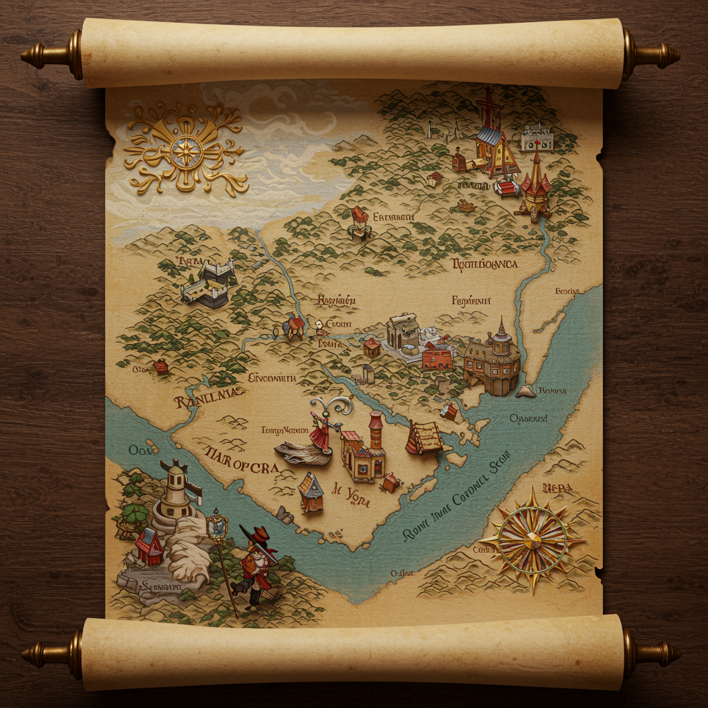 A beautifully unfurled scroll map adorned with raised, three-dimensional artwork, featuring elements of a pop-up oil painting style, enriched by intricate detailing and enveloped in warm volumetric lighting, with a balanced 3:2 aspect ratio.