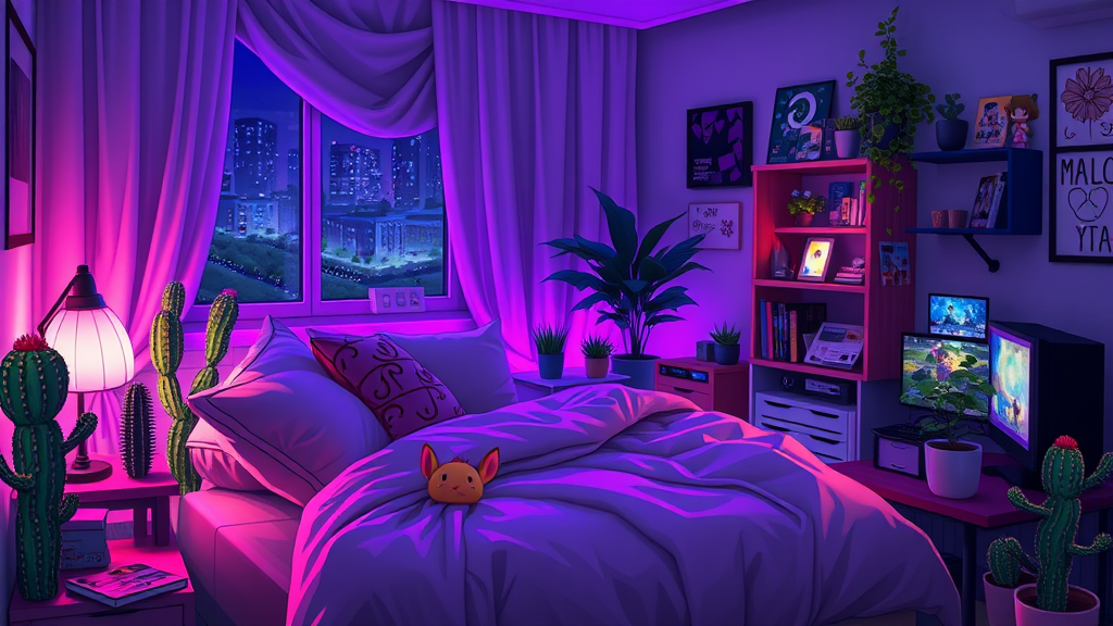 A bedroom infused with an anime-inspired aesthetic, enveloped in the serene ambiance of nighttime, soft purple lights casting a gentle glow over the space. Plush cushions and cozy blankets integrate with the lush greenery of cute cactus plants, blending the charm of nature with otaku culture. A dedicated gaming corner displays beloved anime figures and visual novel memorabilia, creating a haven for a gamer with a love for animated stories.