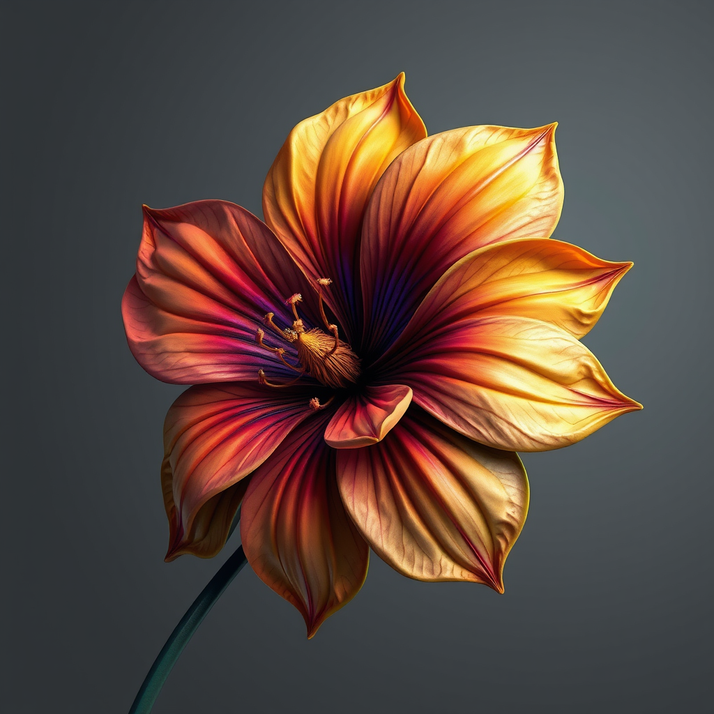 A biomorphic airbrush painting of a vibrant flower with intricate details, set against a muted gray background, inspired by the style of Ernst Haeckel, featuring elements of cloisonnism with bold outlines and rich colors, reminiscent of a piece trending on ZBrush Central, the composition showcases high detail in petal textures and organic forms, adding a subtle iridescent sheen to enhance the dynamic interplay of light and shadow.