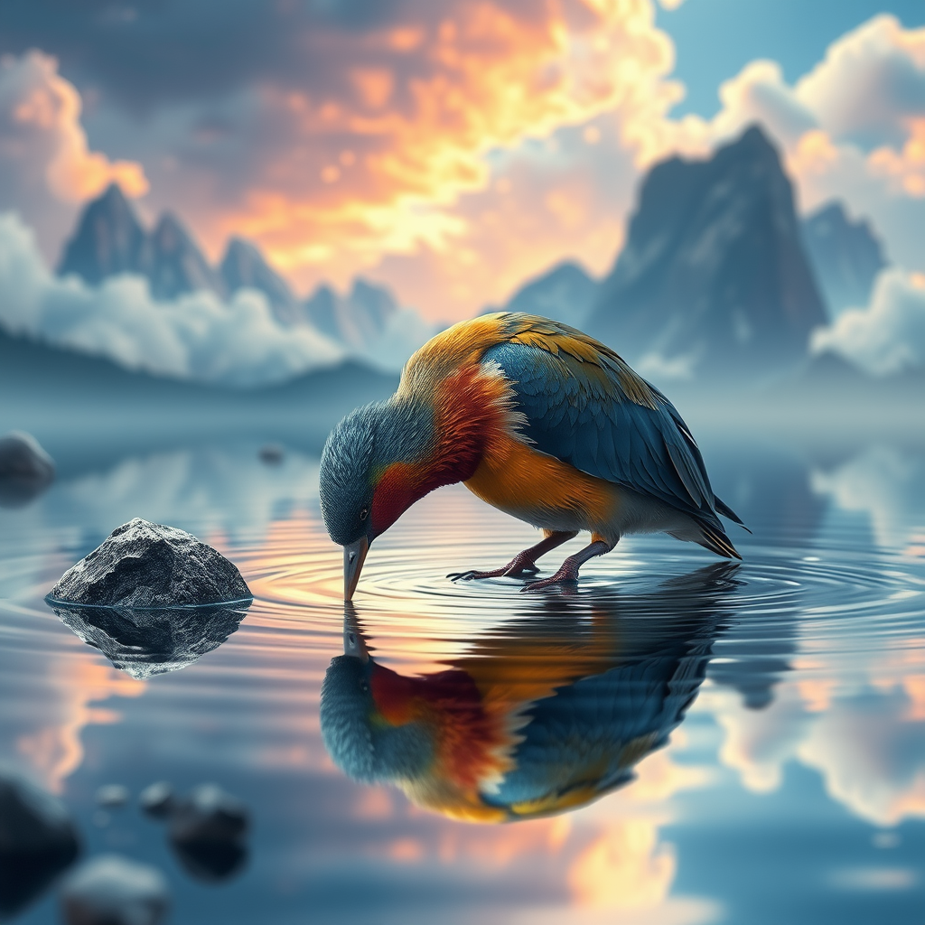 A bird gracefully sipping water amidst a surreal landscape, vibrant colors blending seamlessly, harmonious composition emphasizing natural elegance, intricate feathers reflecting light, captivating and dreamlike atmosphere.
