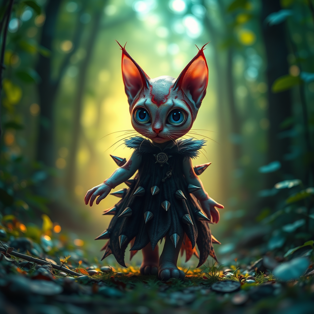 A bizarre big-eyed cosmic squid kitten donning a shadowy dress adorned with spikes wanders through a verdant forest, the scene bathed in iridescent light, capturing the imagination of onlookers with its surreal allure. The composition, inspired by art station trends, features a matte painting aesthetic with cinematic animation lighting and a masterful depth of field, ensuring an ultra-detailed visualization that captivates the senses.