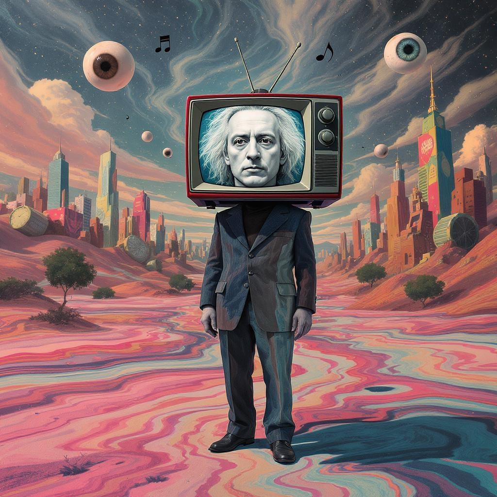 A bizarre scene depicts a figure standing in a dreamlike landscape, where the man's head is an old-fashioned television set. The screen of the television displays a realistic image of his own face, frozen in an enigmatic expression. Oddly, the surroundings ripple with distorted reflections of a vibrant city skyline, with clocks melting off skyscrapers. The man's body is dressed in a mismatched suit that seems to blur and melt into the pastel-colored ground that swirls beneath. In the sky, floating eyeballs and musical notes drift by, casting shadows on the surreal scene below.