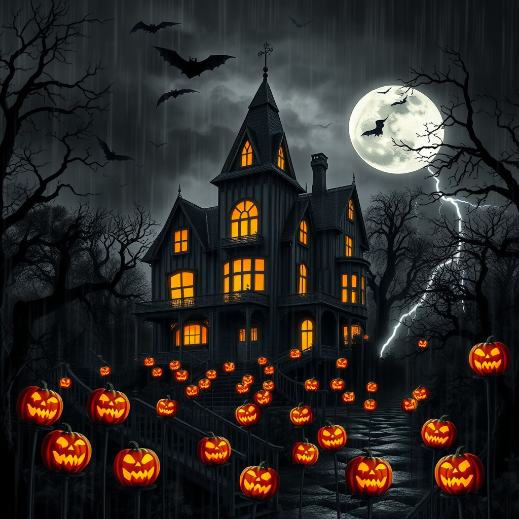 A black and white eerie haunted mansion looms under a turbulent night sky, surrounded by a dense haunted forest. Glowing jack-o-lanterns in vibrant shades of orange cast an otherworldly light across the twisted paths. Bats flutter ominously around the ancient, creaking trees, their wings silhouetted against the glowing full moon. Torrential rain blurs the boundaries between shadow and light, adding to the ghostly ambiance. Lightning occasionally illuminates the scene, revealing fleeting glimpses of mysterious figures that disappear with the next gust of wind.