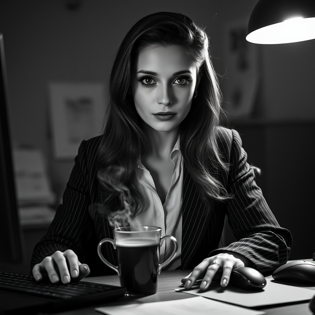 A black and white film stock image capturing a high contrast, full body shot of the world's most beautiful detective, exuding classic Noir 1940's charm. This private investigator, with long, shiny hair and a detailed, symmetrical face, sits gracefully at a desk. Her dark reflective eyes draw immediate attention, enhanced by subtle makeup. A cup of hot coffee sits beside her, casting delicate steam into the air, with dust particles illuminated by detailed, dramatic rim lighting. Dressed in pinstripe trousers, she embodies elegance and mystery under a ceiling lamp, which intensifies the atmosphere. The background, softly blurred, maintains a depth of field that keeps the attention on her poised figure. A keyboard and mouse hint at modernity, while her overall style remains distinctly vintage. The photograph is reminiscent of classic black and white photography, capturing the essence of a timeless detective scene.