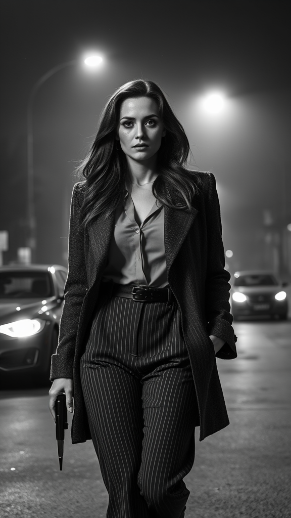 A black and white high-contrast film noir scene set in the 1940s featuring a stunning female detective walking down a misty street at night. Her long, shiny hair frames a face dotted with freckles and punctuated by dark, reflective eyes and classic makeup. She is clad in pinstripe trousers and a tailored tweed coat, embodying the elegance and allure of the era. Streetlights cast dramatic, rim-lit shadows, while dust particles float through the foggy air. The high-contrast black and white photography accentuates the depth of field with sharp focus on her confident stride. Modern cars subtly blend into the vintage backdrop, adding a touch of timelessness. The scene captures the essence of the noir aesthetic with an evocative and mysterious atmosphere, avoiding any distortion or unrealistic elements while paying homage to the iconic detective genre.