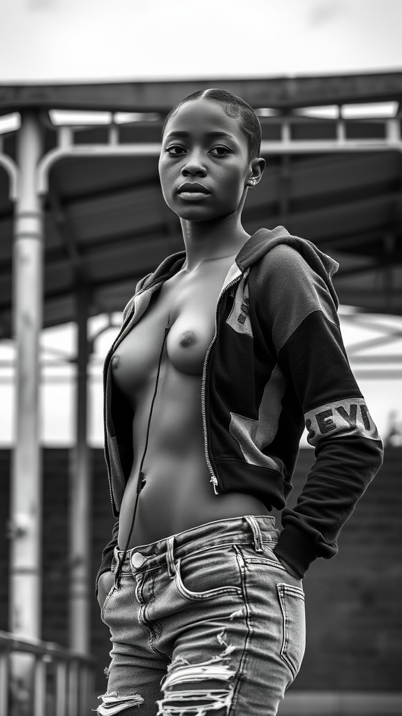 A black and white photograph captures a 24-year-old Fulani-Chechen female swimmer shot from a distance, embodying a sense of graceful curiosity and wonder. Her sculpted body showcases firm arms, a flat chest with toned muscles, and a light sheen on her fair skin that softly reflects the light, while details like skin pores and texture are in sharp focus. Her shield-shaped, subtle pale grey eyes are framed by long, elegant eyelashes, and her curved, bushy eyebrows highlight her delicate features. She wears layered, patchwork hoodies with exposed zippers and a midriff, and distressed jeans with uneven cuts, her body slightly turned with one hand in a pocket. In the composition, framed by the rule of thirds, fractured metal columns support a roof in the background, captured in a style reminiscent of Viviane Sassen with a touch of creative abstraction.
