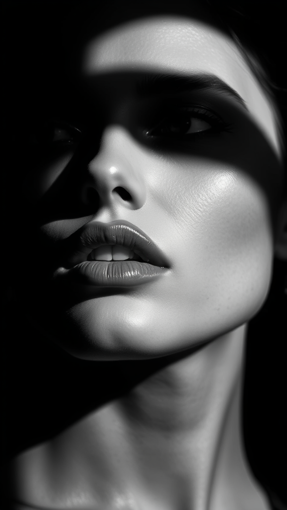 A black and white photograph featuring the face of an alluring woman, her lips at the center of attention, bathed in deep shadows, crafted for a fashion magazine cover or advertising. This image embodies high contrast, elegance, and mystery, reflecting a modern, artistic, and iconic style. The composition is minimalist yet powerful, simple yet captivating, with a stylish and striking aesthetic that highlights beauty in its purest form. Featuring a slightly abstract interpretation, the photograph maintains a sense of intrigue and sophistication in the minimalist tradition.