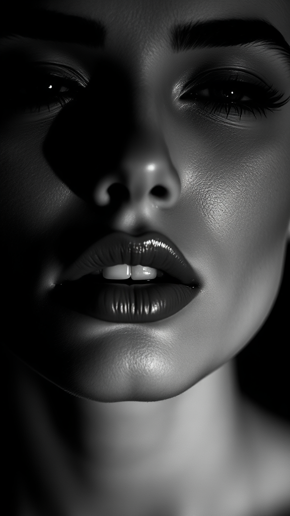 A black and white photograph showcasing the face of an alluring woman, her lips highlighted by deep shadows, crafted for a chic magazine cover or high-end fashion advertisement. The image exudes high contrast and minimalist elegance, evoking a sense of mystery and modern sophistication. Its artistic and iconic style is both striking and beautiful, blending captivating power with simplicity. The composition is stylish and stylized, maintaining the essence of minimalism, ensuring a timeless and evocative visual impact.
