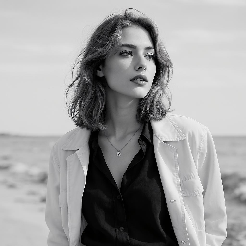 A black and white portrait captures a young woman with shoulder-length wavy hair, exuding effortless style. She is dressed in a casually chic ensemble with an unbuttoned light jacket layered over a fitted dark blouse, adorned by a delicate necklace featuring a tiny charm. Her minimal makeup enhances her natural beauty, while her gaze is thoughtful, directed towards the horizon. The monochrome palette highlights her poised elegance and timeless charm.