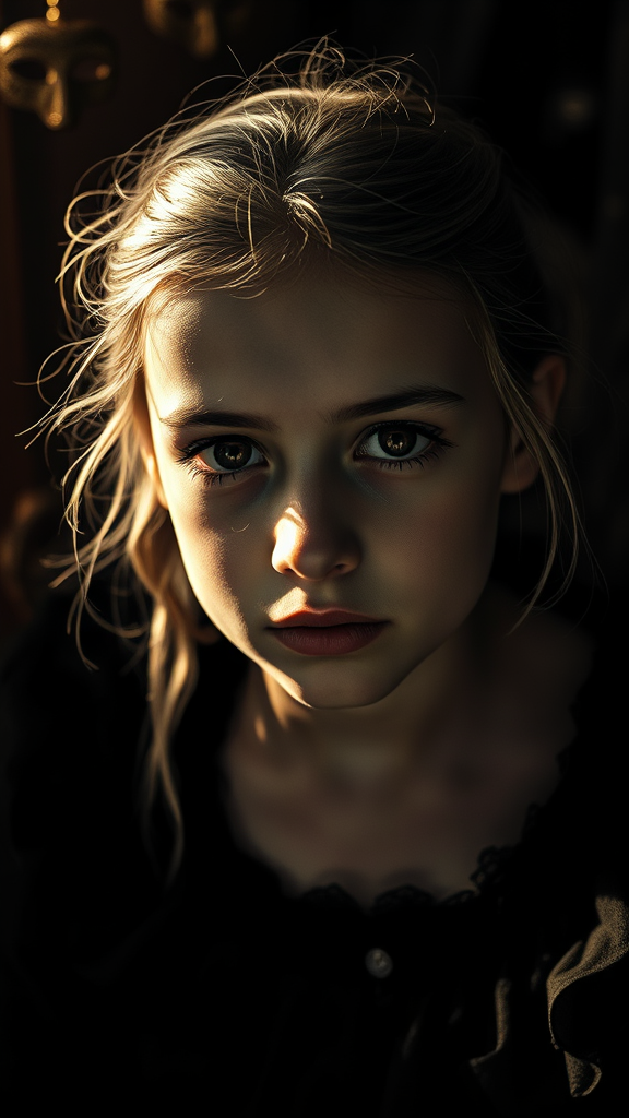 A black and white portrait of a young girl with a hauntingly beautiful aura, captured in a dark atmospheric style. The image is hyper-detailed and realistic, reminiscent of a Hasselblad 500c/m creation. The background features subtle carnivalesque elements, with hints of masked figures and circus motifs. The golden light softly illuminates the girl's features, casting delicate shadows that enhance the mood. Captured with a Sony Alpha a1, the image is ultra-high definition, showcasing intricate textures and contrasts, framed in a 69:128 ratio for a mesmerizing effect.