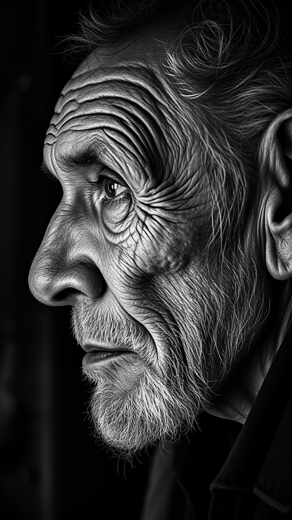 A black and white side profile portrait of an elderly homeless man with a weathered face, embodying a lifetime of experiences and challenges. The monochrome setting emphasizes the intricate details of his features, from the deep lines etched into his skin to the weary yet wise expression in his eyes. Set against a shadowy background, his expression is a complex mix of melancholy, wisdom, sanity teetering on the edge, and perhaps a touch of defiance. The image, captured with a Mamiya camera, conveys a raw, unfiltered glimpse into the life of someone who has seen and endured much, leaving an indelible mark of resilience and vulnerability.
