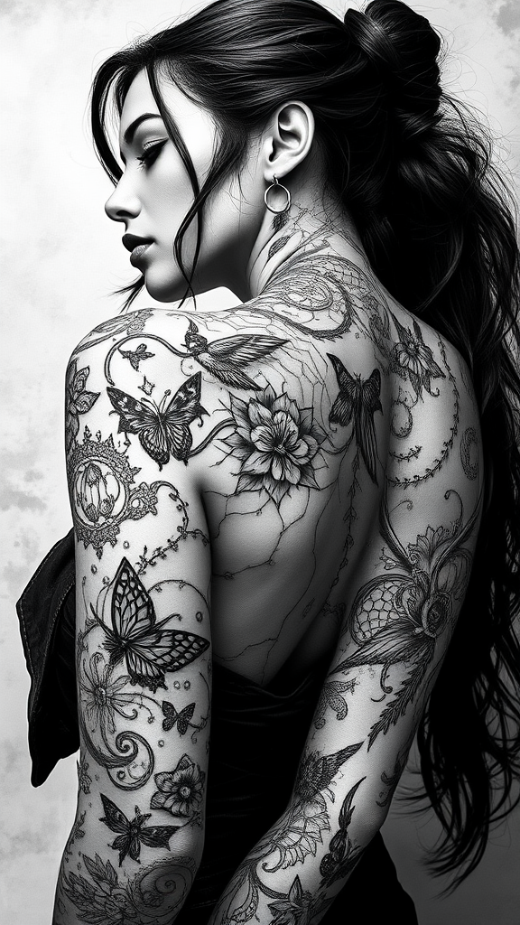 A black and white tattoo on a woman, capturing the essence of intricate fantasy art, evokes a sense of contemplative tranquility, etched like a lithograph, rich with layered details, intertwined with wire-like patterns, showcasing striking character designs. The piece dances on the border of metafiction, inviting the observer into a world where art and reality blend seamlessly.