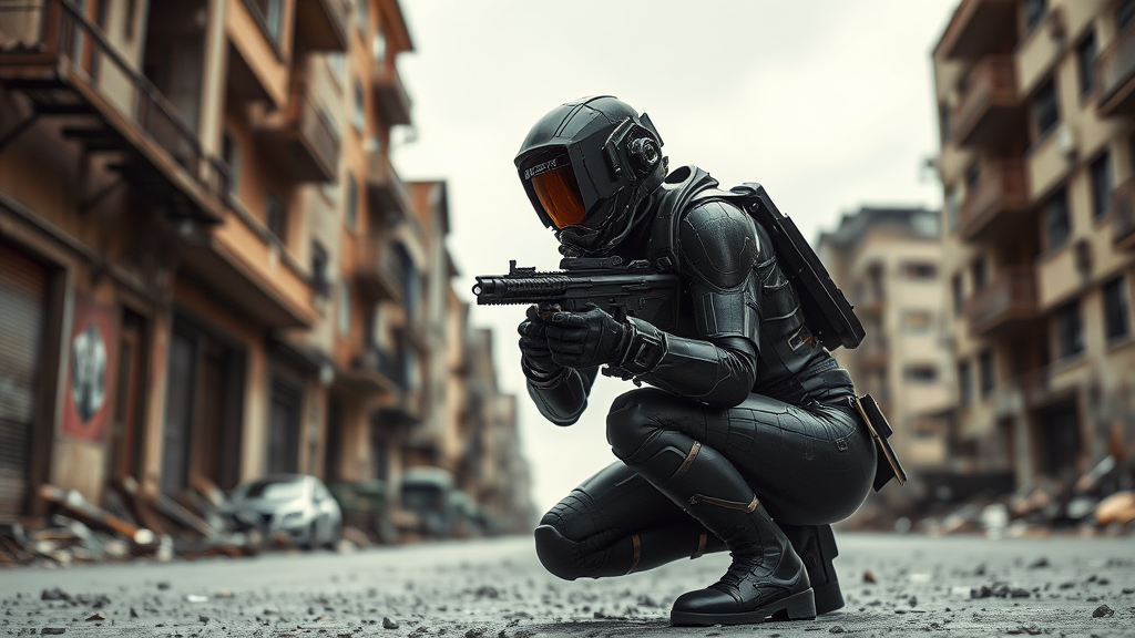 A black armed female figure in futuristic battle armor crouches on one knee in a ruined city street. She wears a cybernetic helmet with an integrated sci-fi visor over her bald head. The figure is intensely focused, weapon in hand and aiming with precision. Her armor combines elements of plate and insulated design, resembling a high-tech spacesuit adorned with intricate details. The overcast sky lends a moody atmosphere, captured in a photorealistic, cinematic style. The scene utilizes natural textures and light, enhanced by ray tracing for highest quality and detail. Presented in a third-person view, the image features a subtle blur effect and long exposure, making use of 8K Ultra-HD resolution with natural and cinematic lighting to create a striking visual reminiscent of a sci-fi movie.
