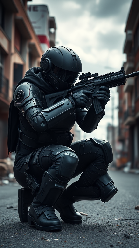 A black armed female figure in futuristic battle armor with a sleek, tech-enhanced helmet crouches on one knee, aiming with precision. Her mask obscures part of a bald head, framed by a high-tech sci-fi visor that gleams with digital displays. Clad in intricate plate armor that integrates insulated sections and spacesuit-like features, she holds a weapon ready for action. The scene is set on a devastated urban street under an overcast sky, illuminated by moody, natural lighting that highlights the photorealism of the environment. The cinematic rendering includes natural textures and a subtle blur from the long exposure, creating a dramatic third-person view. Achieving the highest quality and detail, the image captures the essence of a sci-fi movie style with ray tracing, offering an 8K Ultra-HD experience. The overall atmosphere evokes intensity and suspense, maintaining a dynamic yet realistic portrayal of this formidable armed figure.