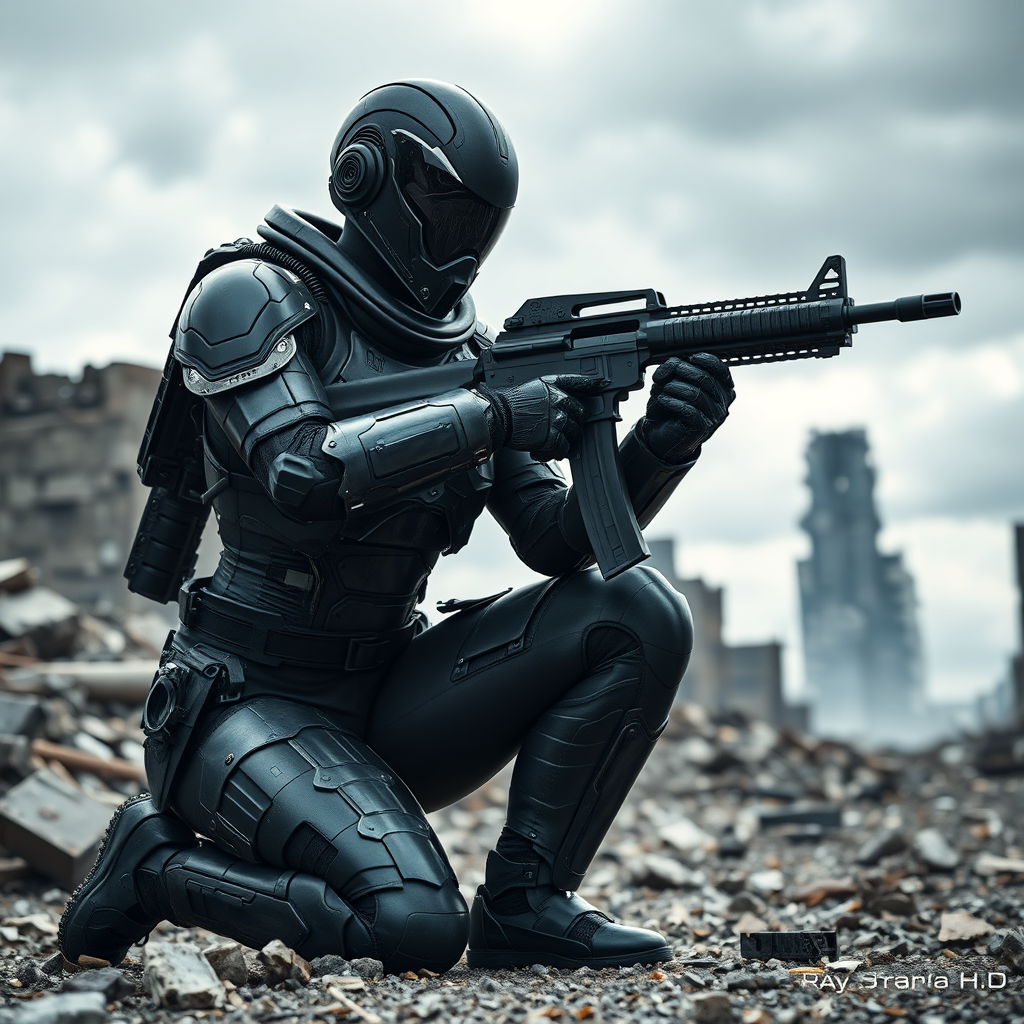 A black armed female figure in futuristic battle armor, featuring a sleek cybernetic helmet and a high-tech visor, kneels on one knee amidst the ruins of a crumbled city. Her bald head is partially obscured by the mask that integrates seamlessly with her armor, which is adorned with intricate details and insulated for maximum protection. She holds a formidable weapon, poised and ready, with her focus evident in her aim. The armor resembles a space suit, with its multi-layered plates and fine craftsmanship, capturing the essence of a sci-fi movie aesthetic. The scene is set against an overcast sky, lending a moody and dramatic atmosphere. Photorealistic textures and natural lighting work in harmony to create a cinematic rendering of this moment, enhanced by ray tracing. Viewed from a third-person perspective, the composition includes a subtle blur effect, reminiscent of long exposure photography. Captured in 8K Ultra-HD, the scene's lighting draws attention to the intricate design and craftsmanship of the armor, enveloping the figure in an intense and immersive sci-fi narrative.
