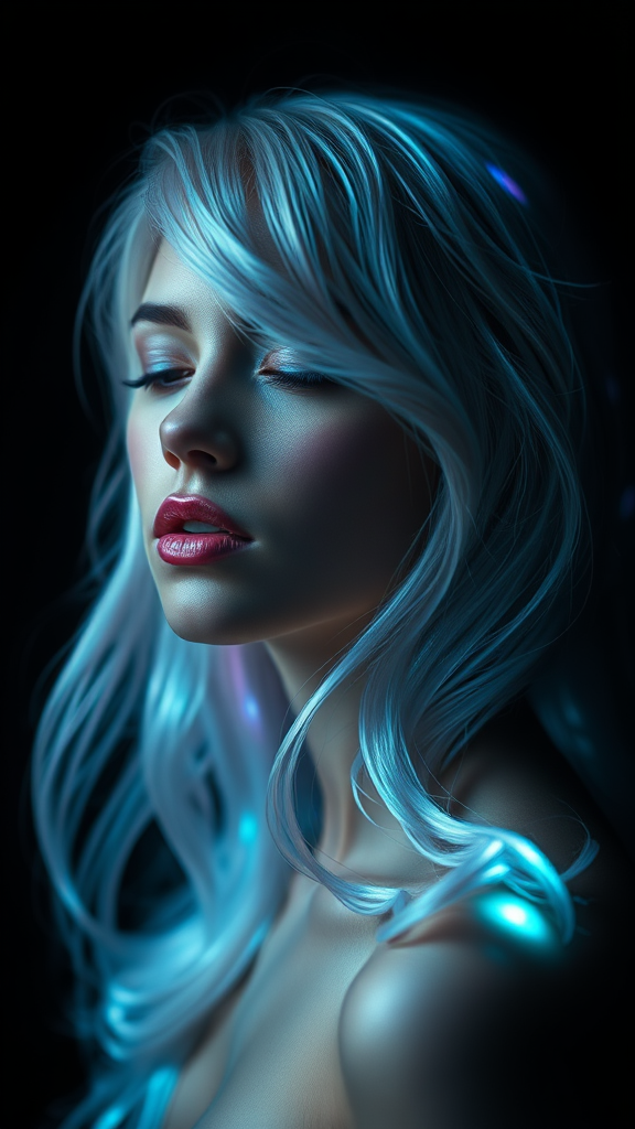 A black background featuring a woman with iridescent opalescent hair, blending the surreal essence of trippy photography and fluid expressionism. Her form is slightly distorted yet maintains detailed facial features, embodying a ghostly allure in hues of dark white and light cyan. The scene is a dance of glowing pastels that evoke a ghostcore ambiance, with ethereal highlights that shimmer across the composition. The overall effect is a mesmerizing interplay of blurred boundaries and vivid focus, capturing the mystique of otherworldly beauty.